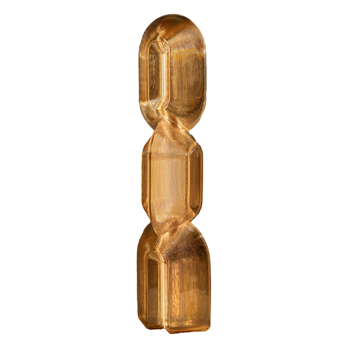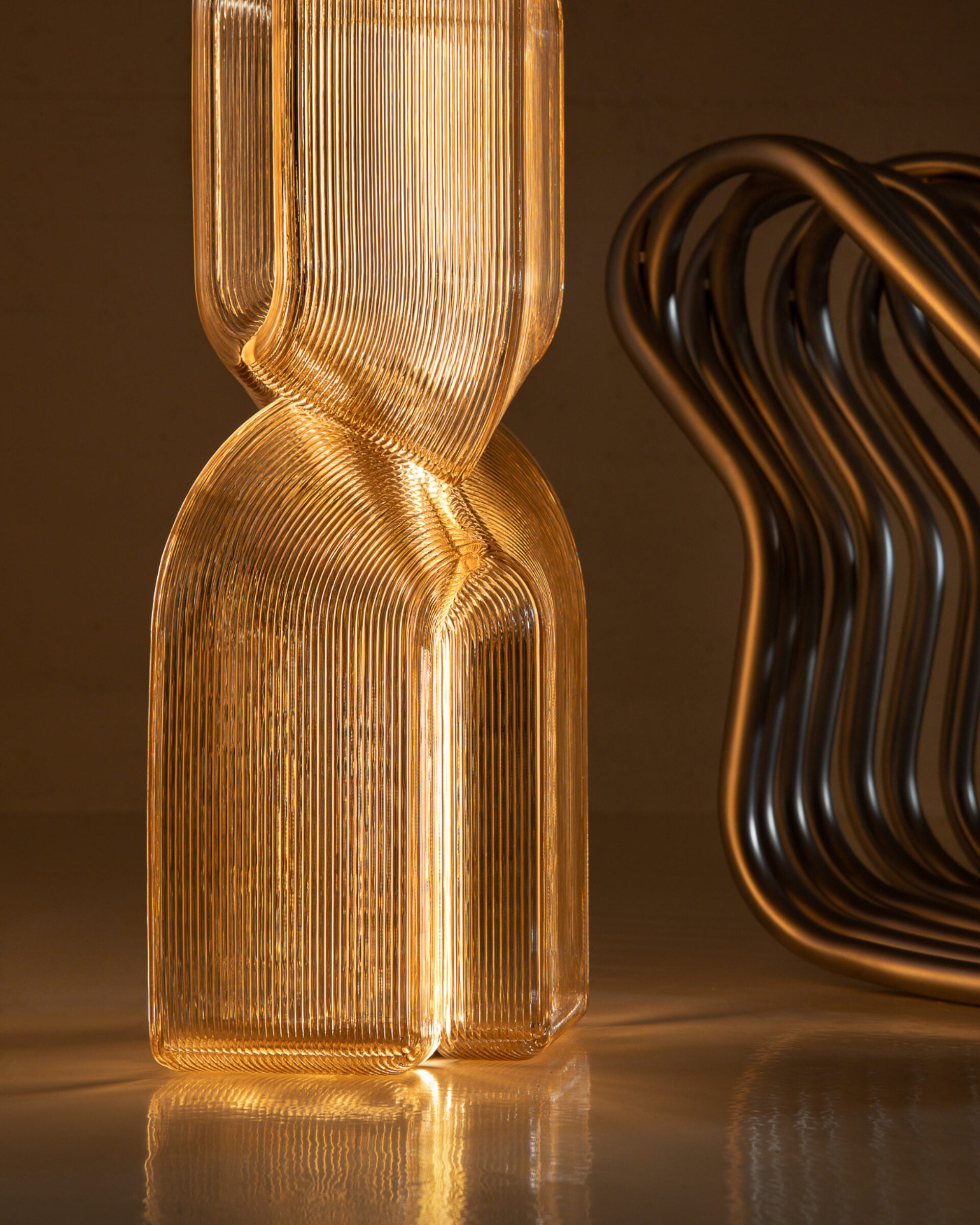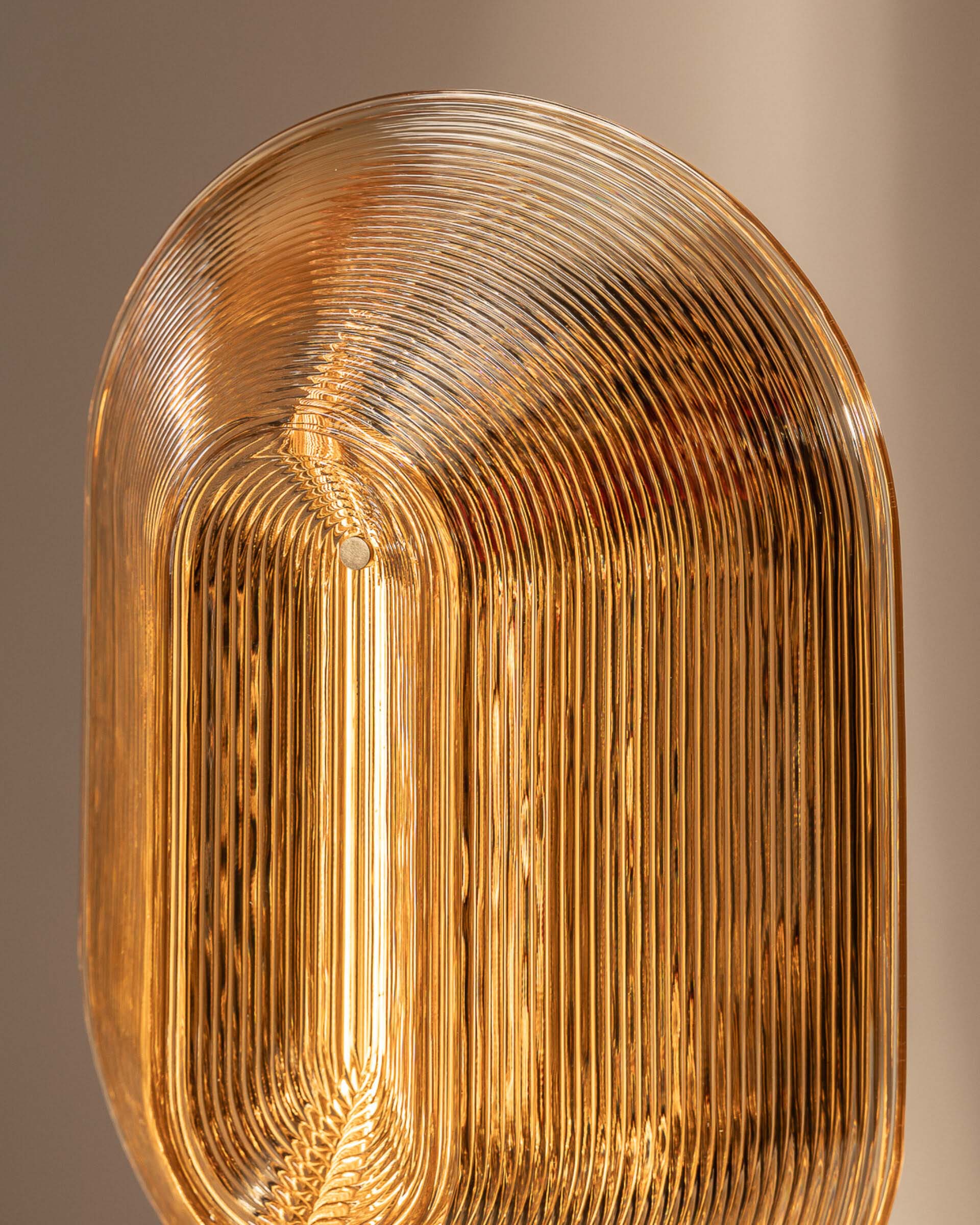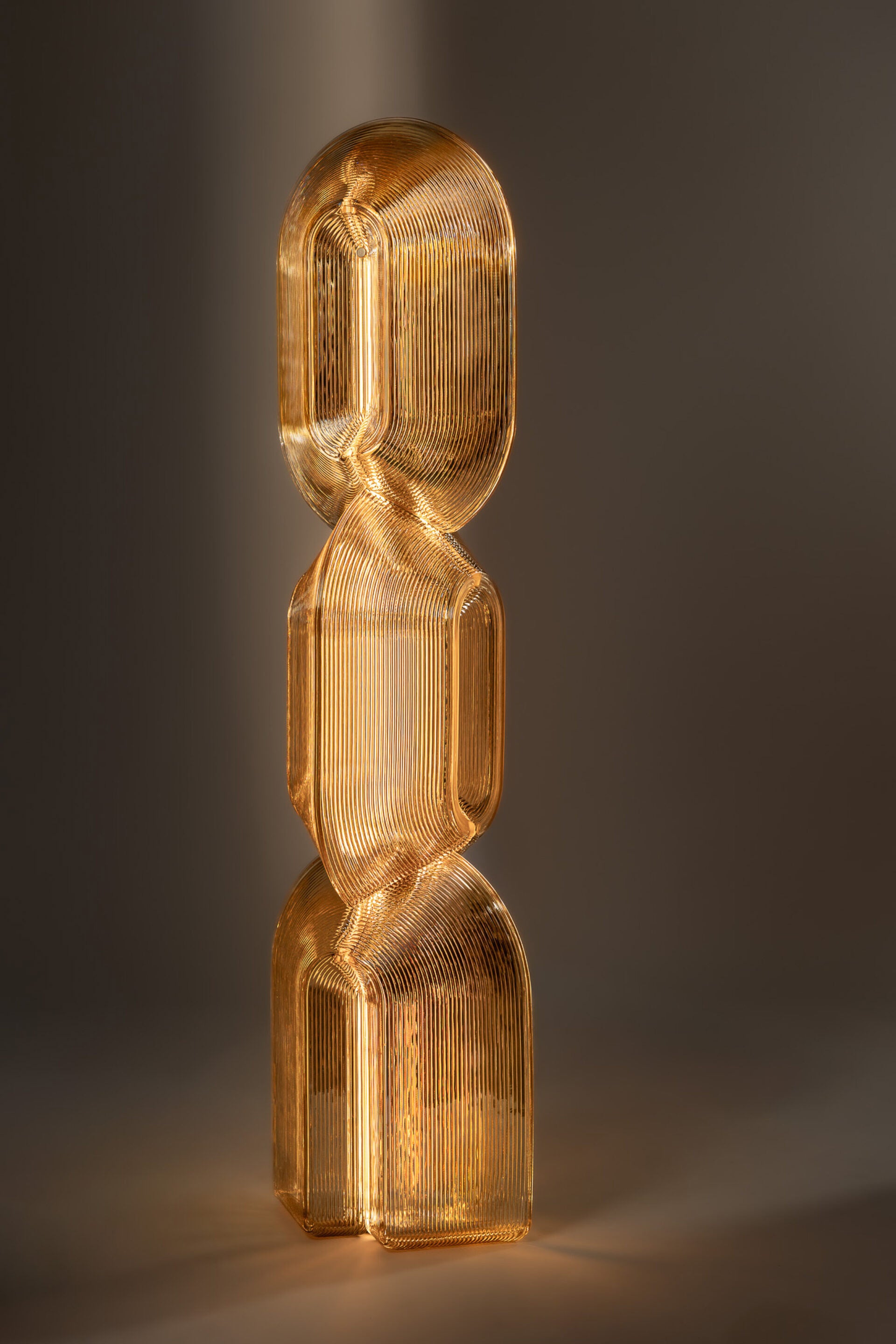 Accrete explores how linear fluting softens light, while a curved and folded double-wall structure gathers it into gentle peaks and lows. It is composed of low-resolution, robot-extruded modules that rotate at each transition, causing the form to shift as the viewer moves around it. Working within the constraints of the robotic process results in a technical, retro-futuristic aesthetic with a warm, radiant glow. A tactile brass button at the deepest point of the top module controls power and dimming.