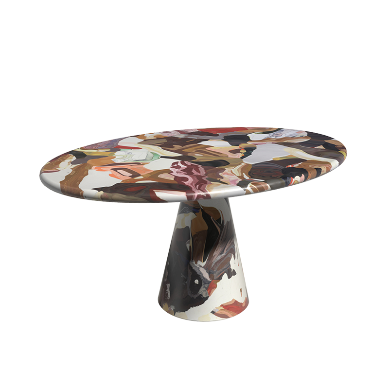 The Meltingpot table offers a third life to recycled plastic prototypes and colour tests from the Kooij studio. Daily, their in-house colourist composes a table from precious, fleeting resources. As such, each piece is a one-off interaction between intuition, material, and chance. Pressed from studio prototypes and colour tests, the tables are completely solid—with patterning enveloping the top, edges and underside of the table.