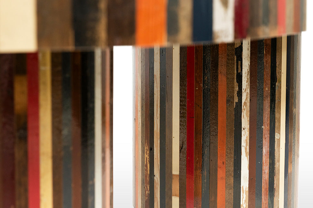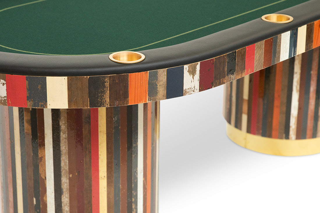 This unique poker table was specially designed by Piet Hein Eek for one of our clients. Made from scrap wood, plywood, custom printed official gaming felt, solid brass cupholders in upholstered black leather edge and custom poker chips. Finished with a high-gloss lacquer. A beautiful and stylish design, created with a great craftmanship.