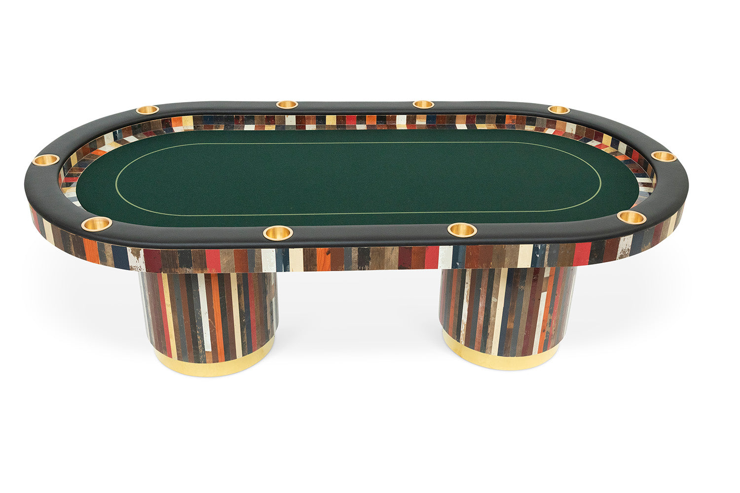 scrap wood, plywood, custom printed official gaming felt, solid brass cupholders in upholstered black leather edge and custom poker chips.